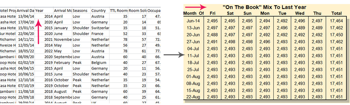 - Pivot daily arrivals into a Friday-to-Thursday matrix to see trends easily.